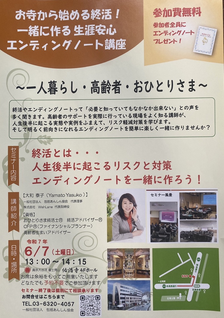 一般社団法人 包括あんしん協会では「お寺から始める終活!一緒に作る生涯安心エンディングノート講座」として、下記要領でセミナーを開催します。
